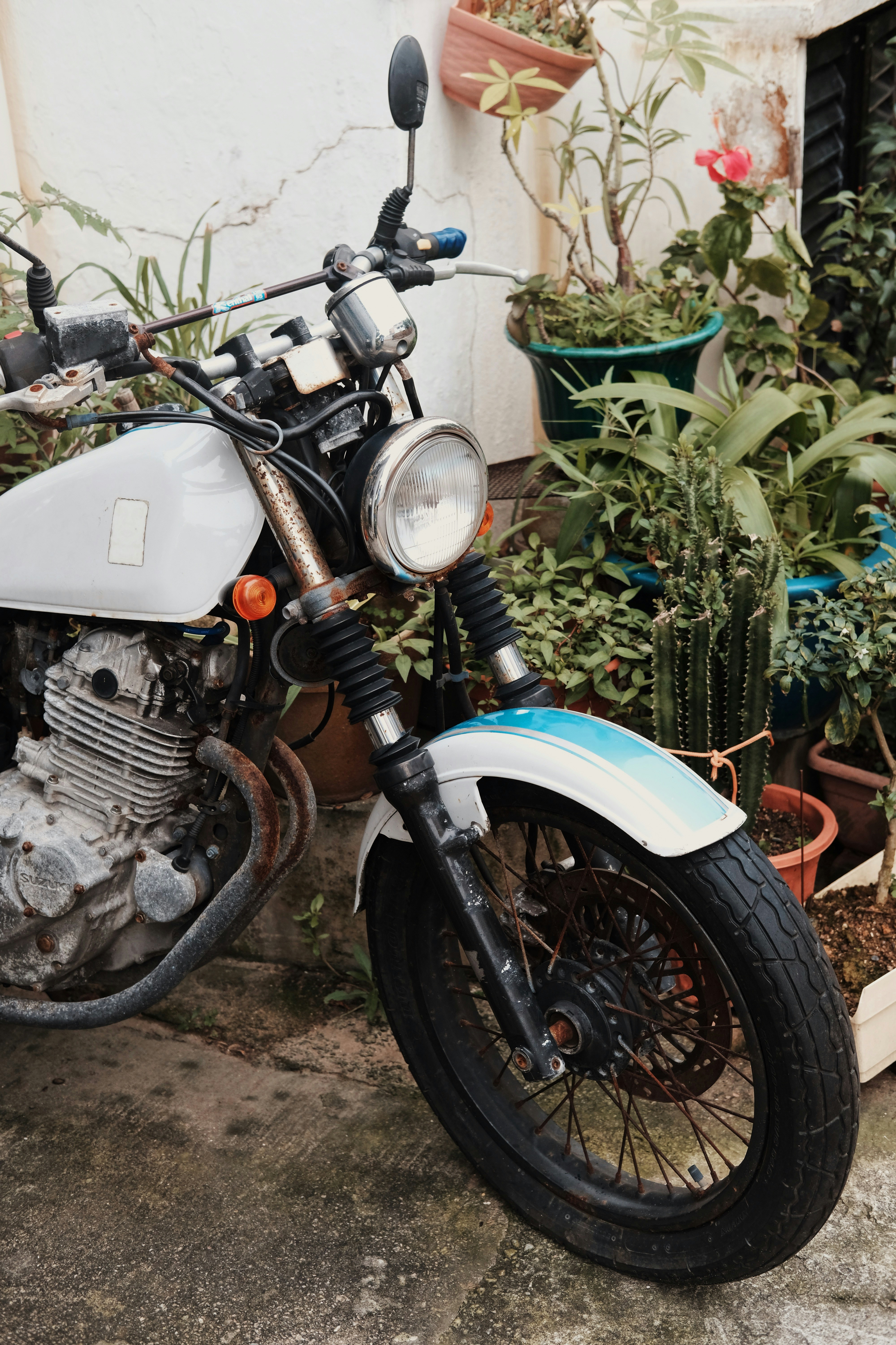 White Standard Motorcycle Beside Plants Photo Free Machine Image On Unsplash