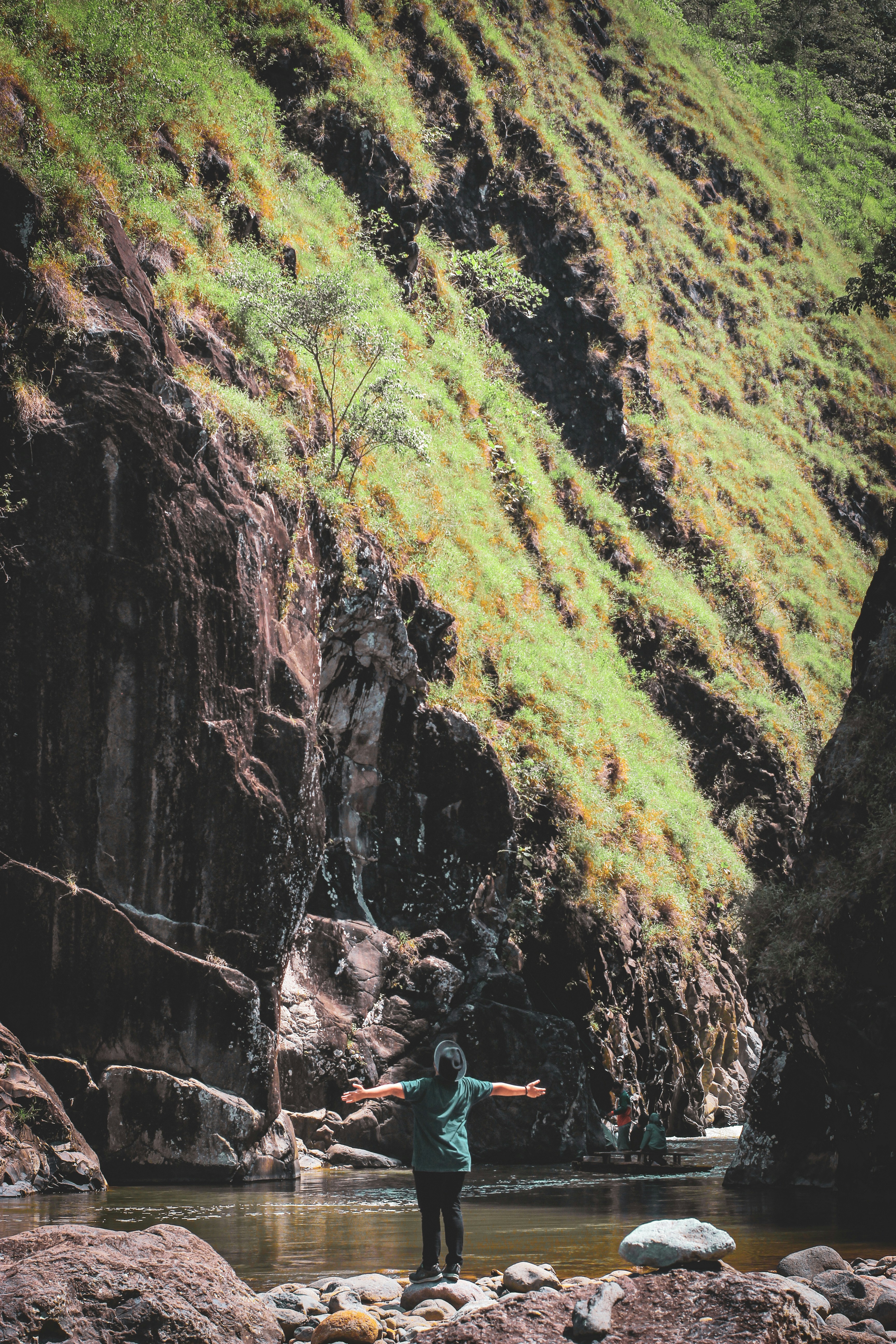 Person Standing On Rock By The River With Arms Open Photo Free