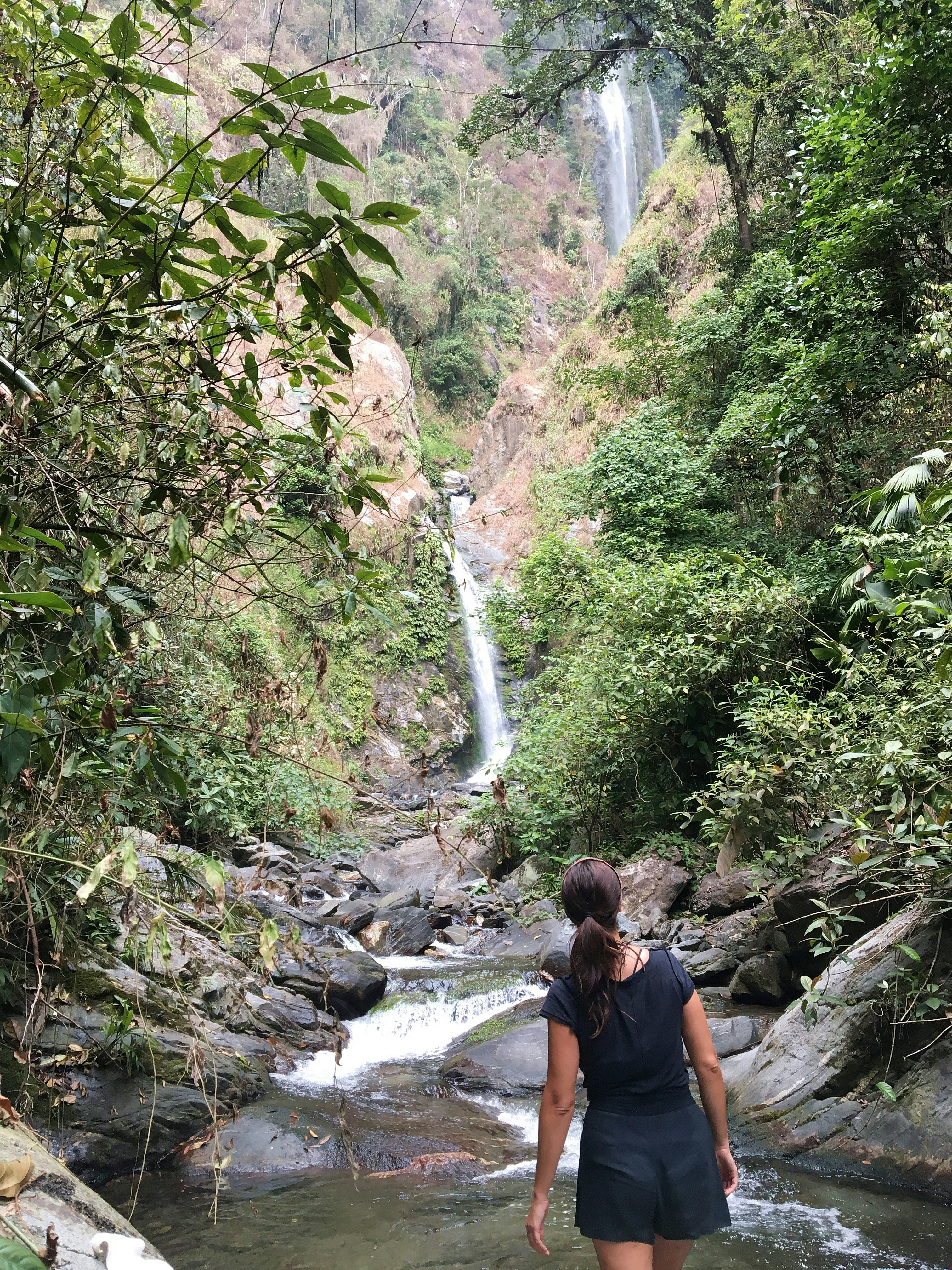 Woman Walking On River Towards Waterfalls Photo Free Nature